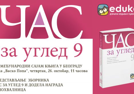 Сала „Васко Попа”, четвртак, 26. октобар, 11 часова ПРЕДСТАВЉАЊЕ ЗБОРНИКА ЧАС ЗА УГЛЕД 9 И ДОДЕЛА НАГРАДА И ПОХВАЛНИЦА Драге колегинице и колеге, поштовани учесници конкурса, аутори и сарадници, Позивамо вас на представљање Зборника ЧАС ЗА УГЛЕД 9 и свечану доделу награда и похвалница, на наше традиционално дружење у оквиру Међународног сајма књига…