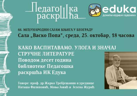 Сала „Васко Попа”, среда, 25. октобар, 18 часова КАКО ВАСПИТАВАМО. УЛОГА И ЗНАЧАЈ СТРУЧНЕ ЛИТЕРАТУРЕ Поводом десет година библиотеке Педагошка раскршћа ИК Едука Говоре: проф. др Жарко Требјешанин и уреднице Наташа Филиповић, Моња Јовић и Јелена Журић За деценију постојања, библиотека Педагошка раскршћа броји више десетина вредних наслова из области филозофије образовања и…