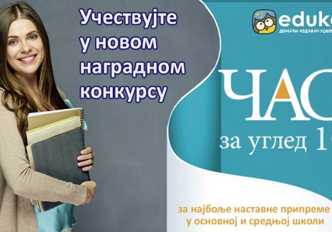 Издавачка кућа „Едука” Београд расписује наградни КОНКУРС ЧАС ЗА УГЛЕД Традиционални Едукин конкурс „Час за углед”, десети по реду, отворен је за најбоље иновативне припреме угледних часова у основној и средњој школи. Пропозиције конкурса 1. Сваки наставник може да пошаље од једне до две припреме. Конкурс подразумева додељивање награда за прво место (60.000,00 динара), друго место (50.000,00…