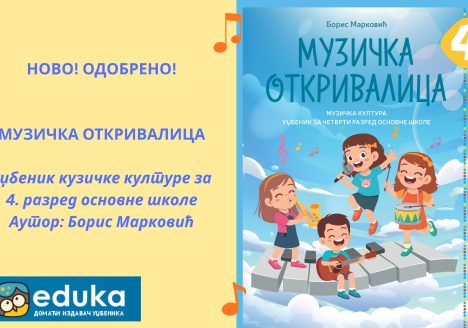 МУЗИЧКА ОТКРИВАЛИЦА, уџбеник музичке културе за 4. разред основне школе Аутор: Борис Марковић Савремен, тематски организован и интегративан водич кроз свет музике, који ученика поставља у активну и истраживачку улогу. Посебност уџбеника огледа се у доследном праћењу принципа од познатог ка непознатом, нарочито у области музичког описмењавања, па се у лекцијама креће од раније обрађених…
