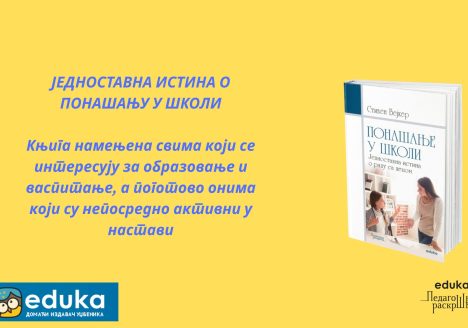 Стивен Бејкер, Понашање у школи : једноставна истина о раду са децом, превела Јелена Тирнанић, ИК „Едука“, Београд, 2025. Пре више од једне деценије Издавачка кућа „Едука“ покренула је специјализовану библиотеку „Педагошка раскршћа“ са намером да објављује најновија дела из области филозофије образовања и примењене педагогије – како би тиме допринела „бржем дотоку и примени…