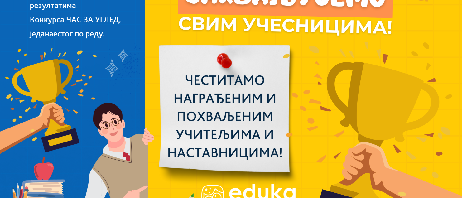 Поштовани учитељи и наставници, С великим задовољством обавештавамо вас о резултатима Конкурса ЧАС ЗА УГЛЕД, једанаестог по реду. Захваљујемо свим учесницима, честитамо награђеним и похваљеним учитељима и наставницима, чије ће припреме бити уврштене у Зборник „Час за углед” 11. Награђени радови ПРВА НАГРАДА Јелица Говедарица, Кристина Беретић, Оливера Црнобрња, Мартина Дувњак, Габријела Јовићевић, Гордана Перовић,…
